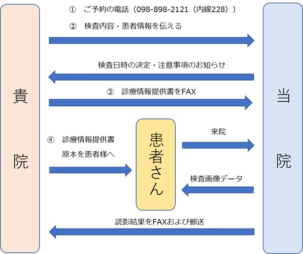 ③診療情報提供書を作成し当院連携室(FAX:098-898-6433)へFAXをお願い致します。