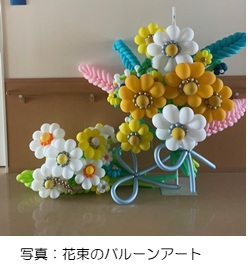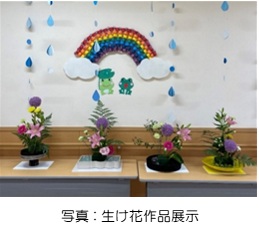 毎月季節の花材を使用し参加者は口頭や視線の動きで職員に思い思いの生け方を伝えられています。また、活動にはボランティアで華道連盟の先生に来ていただいており、アドバイスをもらいながらそれぞれの個性を生かして自由に生けています。作品は院内に展示し、皆さんに楽しんでもらっています。