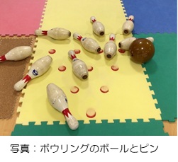 本物のボールとピン、そしてアルミパイプ製の滑り台を使用します。滑り台に置かれたボールを手や細い棒で突き参加者の身体機能に合わせて投球していきます。高スコアを目指し、毎回盛り上がる活動です。